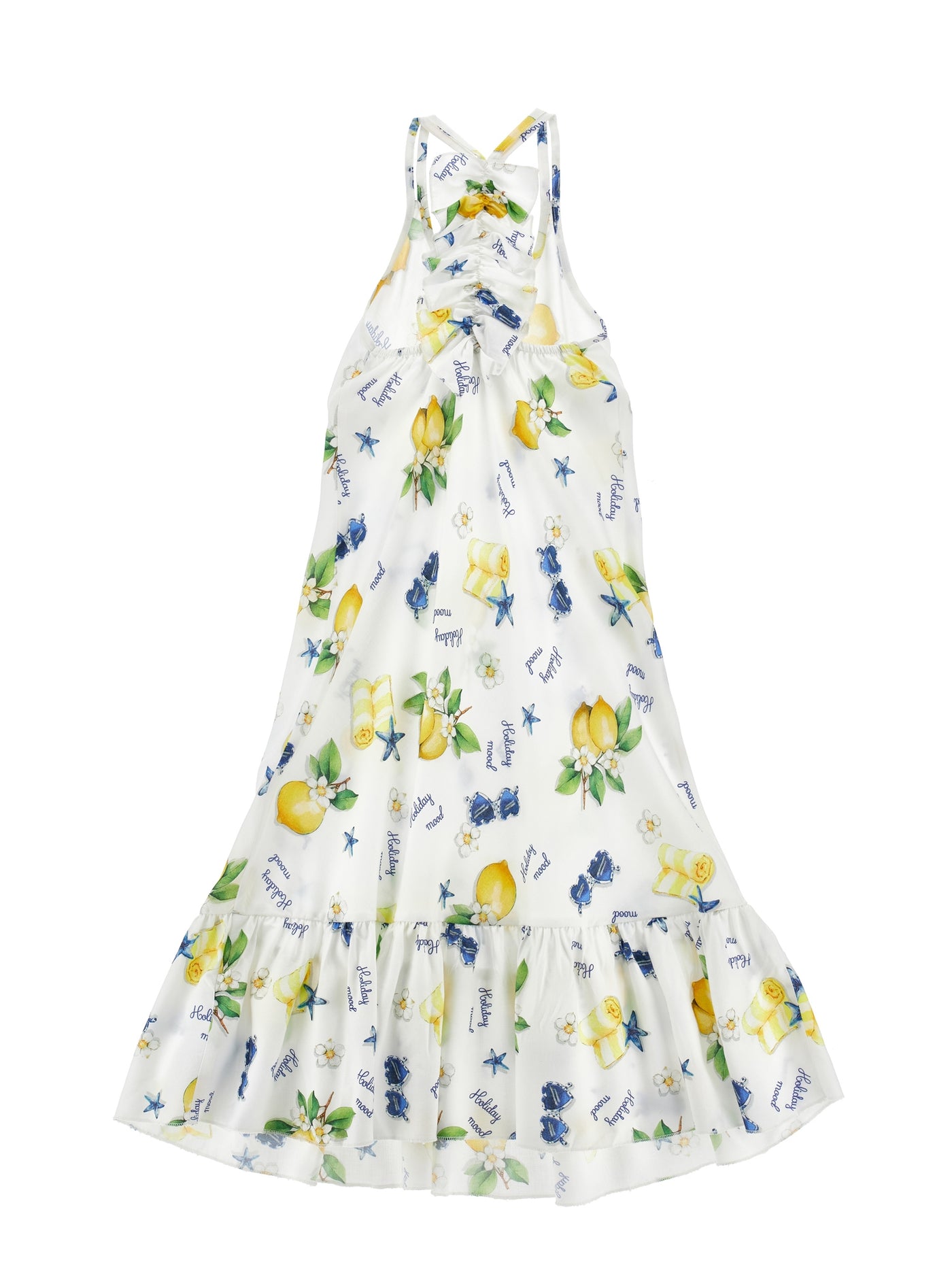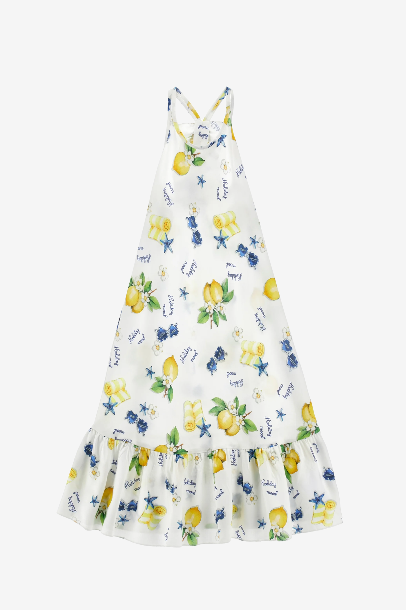 Ein sommerliches Maxikleid mit fröhlichem Zitronen-Print. Der lange, schwingende Schnitt und das leichte Material machen es ideal für heiße Tage, Ferien und besondere Anlässe.