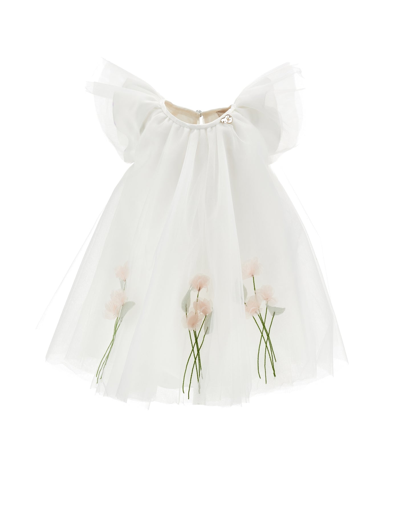 Ein traumhaftes Tüllkleid von Monnalisa mit handgemalten Tulpenmotiven am Saum. Die zarten Flügelärmel aus transparentem Tüll und der leichte, schwebende Schnitt verleihen dem Kleid eine märchenhafte Eleganz. Ideal für Feste, Feiern oder Blumenmädchen-Looks.
